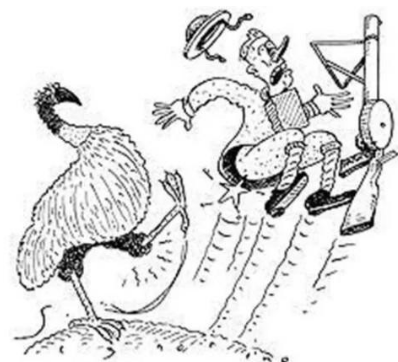一战过后,大量的士兵失去了存在的意义,因为澳大利亚地广人稀,很多地方还是一片荒地,于是这些退伍士兵们被派遣到了澳洲西部的荒野进行开荒。刚开始这些退伍士兵们的日子过得还可以,但是没过多久这种祥和的生活就被一群“傻狍子”们给打破了,这群傻狍子就是现在的澳大利亚珍稀动物鸸鹋,鸸鹋性格憨憨的,完全不惧怕人类,有时候遇上你还会过来打打招呼,交流交流。