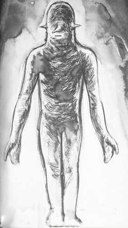 然后从该物体飘出来3个身高大约150厘米的“类人”,他们没有脖子、皮肤是灰色,有皱纹。耳朵很小,眼睛是眯成小小的裂缝,尖尖的小鼻子下面有个像投币孔的开口、手指的部位像是螃蟹的爪子、没有脚趾,腿和脚像连在一起很粗糙、看起来像大象的脚。他们滑向希克森和派克,而其中一个发出噪音,另外两个则没有声音。希克森事后描述该类人发出的好像是机械声。